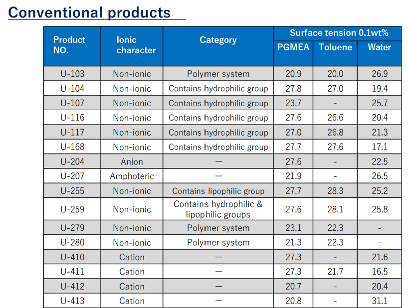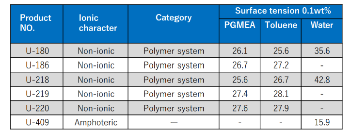 This is a fluorochemical surfactant that does not contain PFAS*.Because it does not contain PFAS, its performance is significantly inferior to conventional products, but it can replace conventional products in some applications. It has been particularly successful in leveling applications.*PFAS is defined by ECHA (European Chemicals Agency)