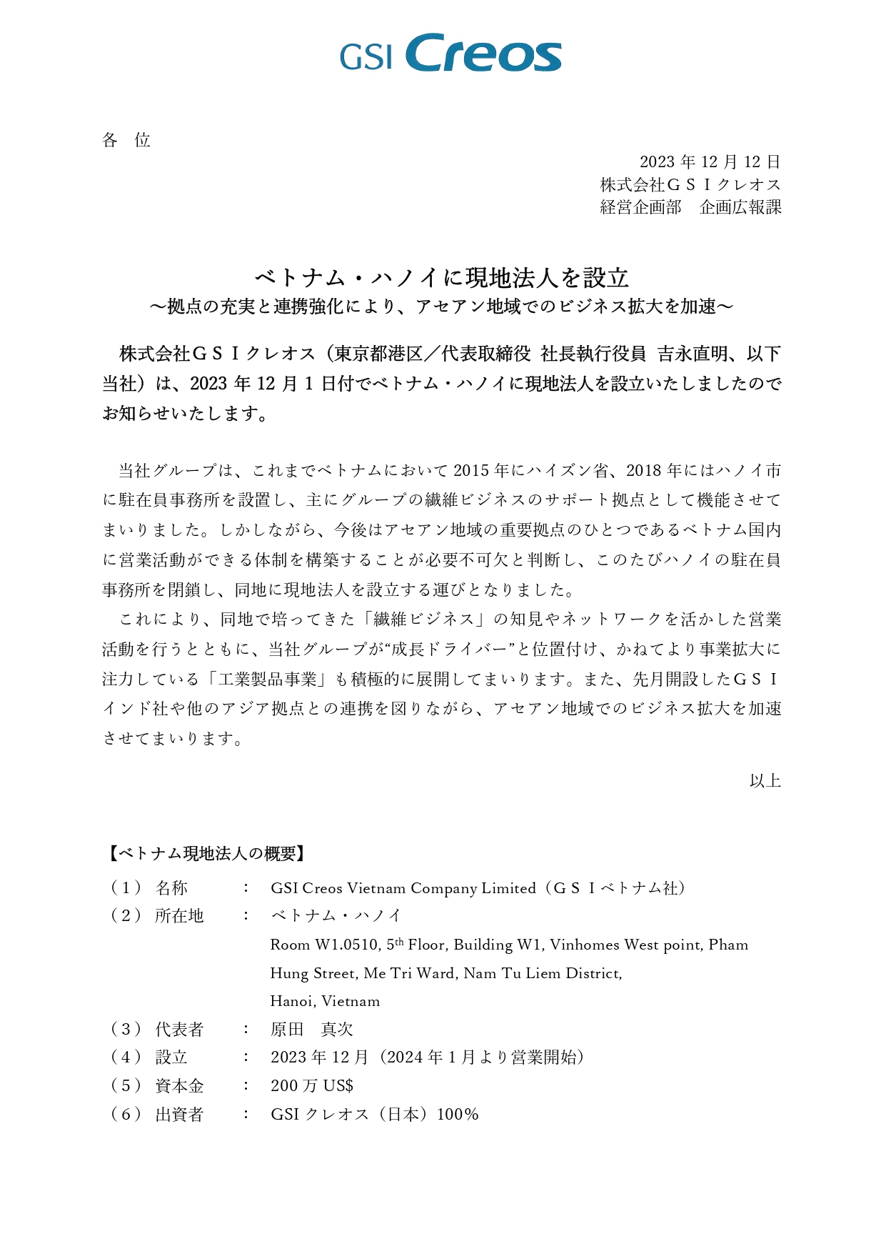 株式会社GSIクレオス(東京都港区/代表取締役 社⻑執⾏役員 吉永直明、以下当社)は、2023 年 12 ⽉ 1 ⽇付でベトナム・ハノイに現地法⼈を設⽴いたしましたのでお知らせいたします。